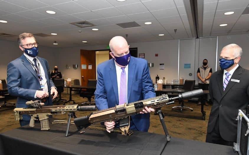 تم عرض بندقية مشاة Textron وبندقية آلية ، والتي ستستخدم ذخيرة تلسكوب جديدة بحجم 6.8 مم ، خلال زيارة الحاكم لاري هوجان.