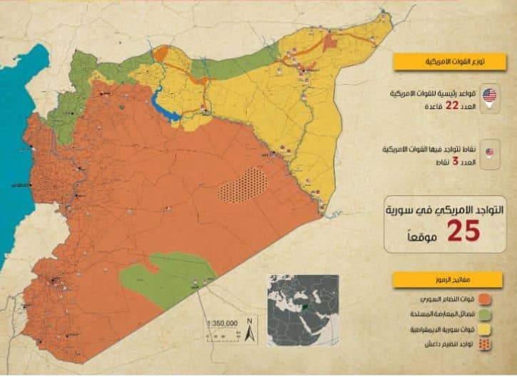 وتظهر الخريطة انتشار القواعد العسكرية الأمريكية في محافظات الحسكة، الرقّة، دير الزور وريف دمشق، في حين تتوزّع نقاط التواجد.