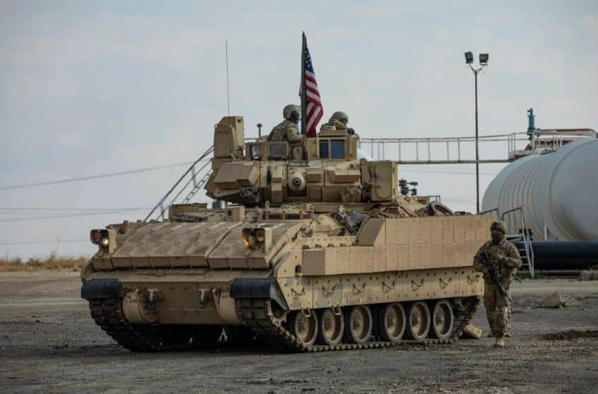 ويواصل الجنود الأمريكيون مع مركبات المشاة القتالية M2 برادلي أداء مهام مهمة من واجبات الدفاع في حقول النفط.