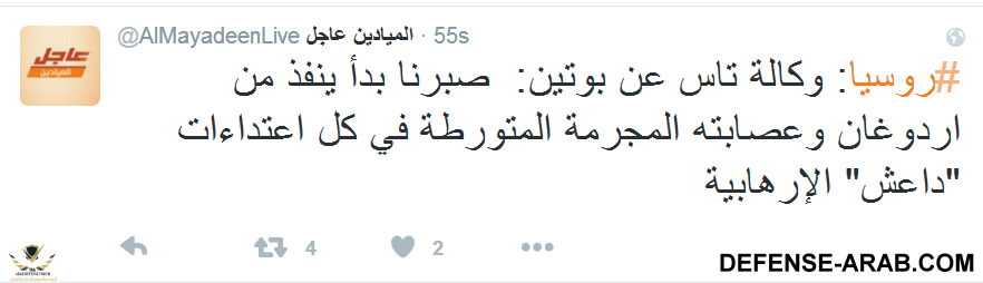 كل الذى اعلمة ان البوابة الوحيدة لدخول داعش هى البوابة التركية واعلم ايضا ان داعش تزبح المسلمين مثل الاضاحى واعلم ايضا ان طيار الاف 16 لو كان يعلم انه سيواجه سوخوى 30 ما اقدم على فعل ذلك واعلم ايضا انهم سيتساقطون كالذباب من السوخوى30 والاس 400 بعد ذلك لو اقتربو من الحدود السورية واعلم ايضا ان المنطقة التى كان يحاول الناتو وتركية جعلها منطقة مغلقة على الحدود السورية التركية اصبحت محرمة عليهم هم