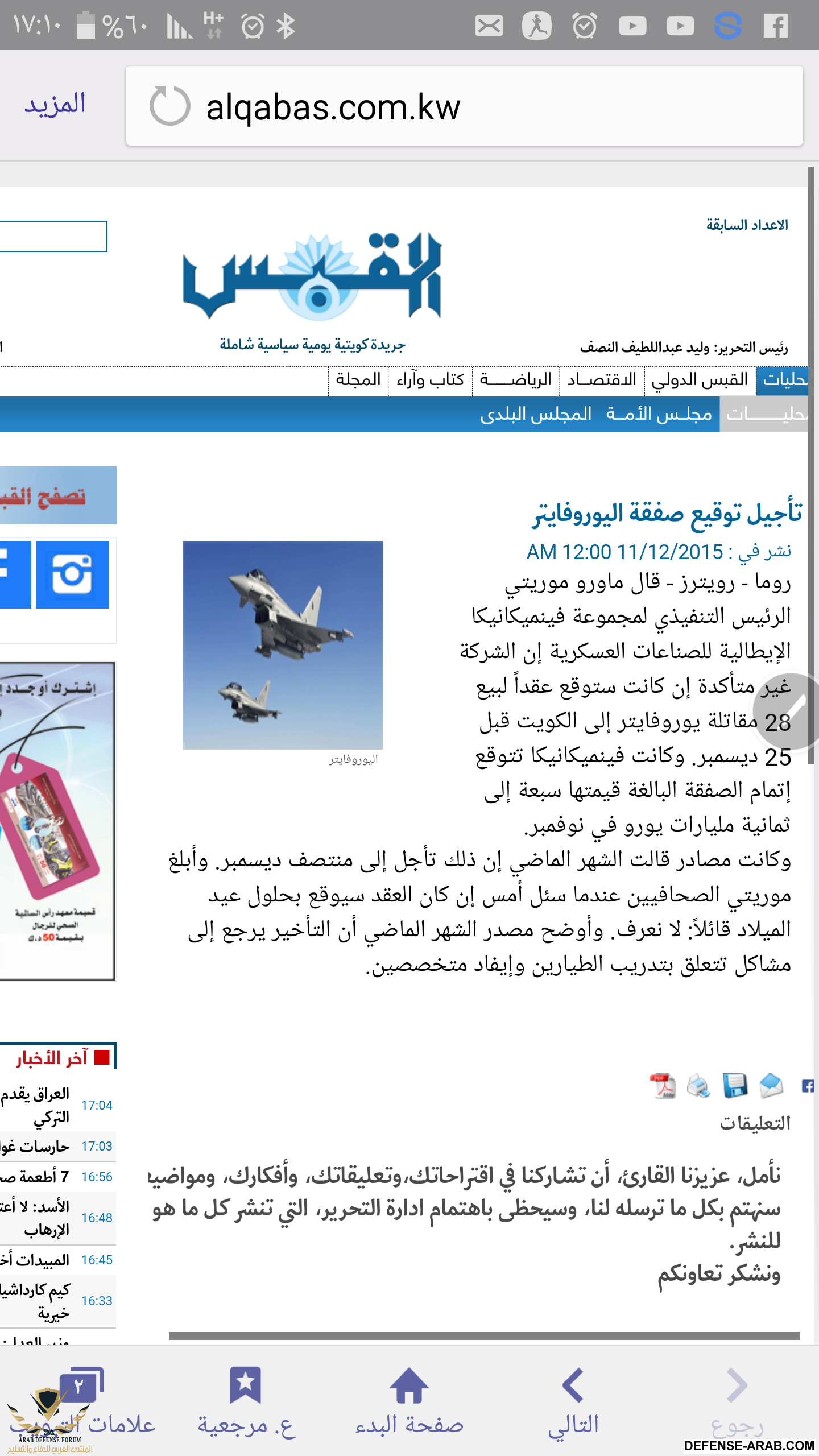 خبر جديد...لتأجيل جديد للصفقه المتوقعه لعدد 28 مقاتله تايفون بين دولة الكويت وبين الكونسرتيوم الاوروبي وتحديدا فرعه الايطالي "فنميكانيكا " ..الخبر يقول بختصار ان الشركه "غير متأكده" من ان توقيع النهائي سيتم قبل عطلة اعياد الميلاد في 25 ديسمبر الحالي ..!!