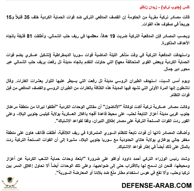 وكانت المدفعية التركية رسمت أمس «الخط الأحمر» لأكراد سوريا بعدم الوصول إلى معبر أعزاز، فقدمت مدفعيتها دعما لوجيستيا لمعارضين سوريين يدافعون عن المدينة في مواجهة محاولات تقدم قامت بها «قوات سوريا الديمقراطية» التي تتألف بشكل رئيسي من مقاتلين أكراد. ونقل موقع «الدرر الشامية» السوري المعارض أن المدفعية التركية بدأت، عصر السبت، استهداف ميليشيات «وحدات حماية الشعب» الكردية بريف حلب الشمالي.