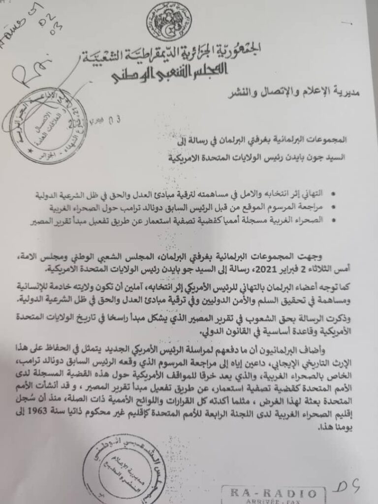 واضحة وضوح الشمس في نهار جميل ، انصحكم تنسوا موضوع سحب الاعتراف الامريكي نهائيا و أنصحكم أن تبحثوا عن طريقة تنهون بها البوليساريو و تنهون هذا المشكل نهائيا ، ليس في صالحكم تمويل قضية خاسرة 50 سنة أخرى لأن المغرب لن يخرج من الصحراء لا حربا و لا سلما و مهما تكون الكلفة المادية أو البشرية ، مجرد نصيحة يشهد الله أنها من القلب ، تحياتي لك