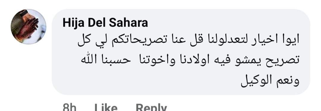 صحراوية من مخيمات الدل والعار لي فهمت من كلامها انها قالت ليهم نقصو علينا تصريحاتكم وتهديداتكم حيت فينما كيهدد شي مسؤول عندهم كيصدقو مبندرين غير هوما، في انتظار تصريح النانة شفتها غبرات
