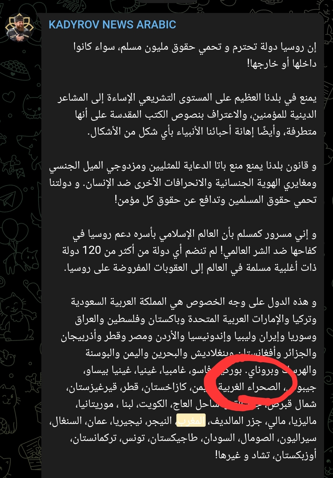 القناة الرسمية الناطقة بالعربية لرئيس الشيشان الموالي لروسيا و المقرب من بوتين رمضان قذيروف كتب هذه المقالة و يفصل المغرب عن صحرائه