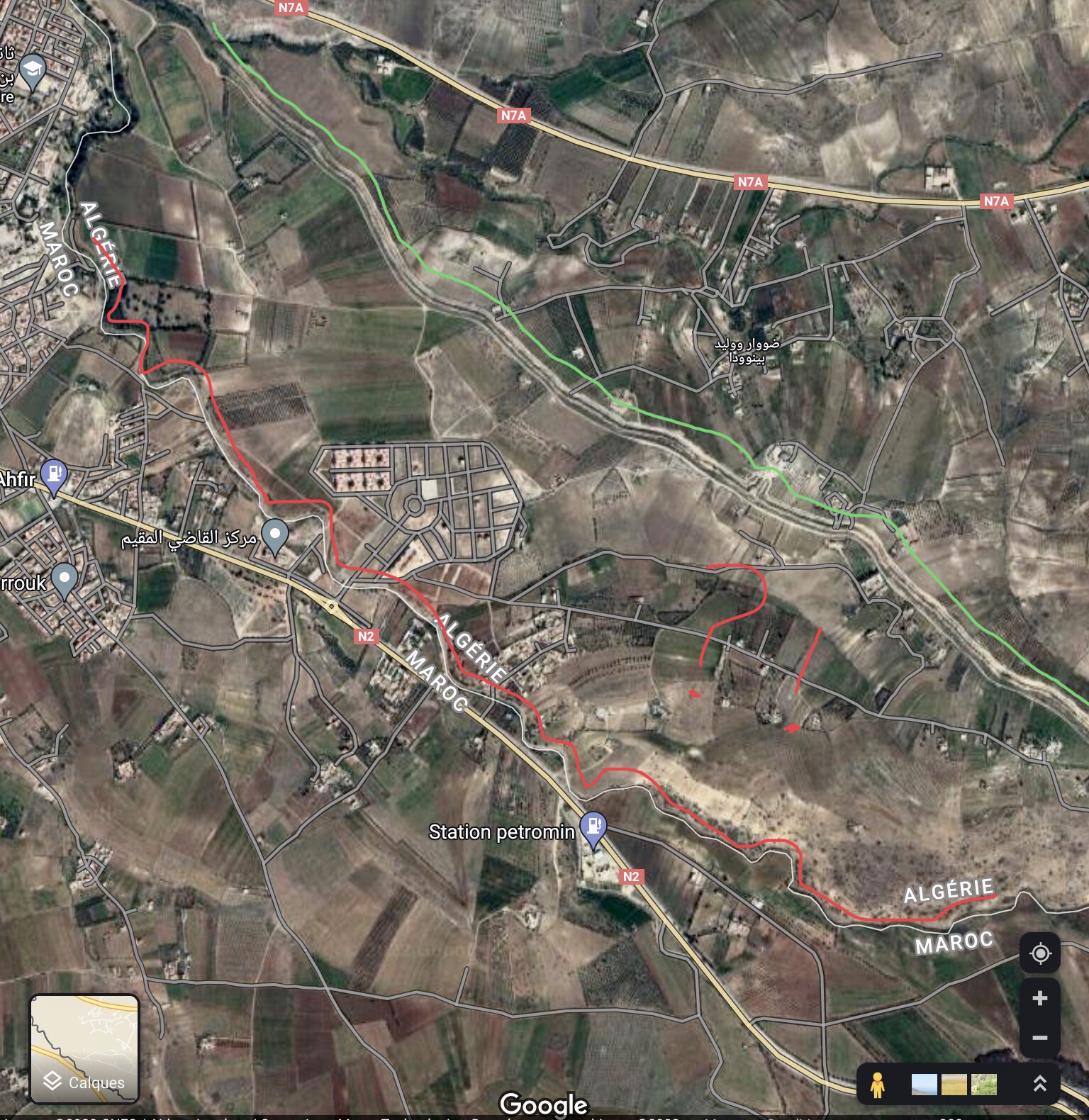 حسب ترسيم غوغل فإن حي كامل من مدينة أحفير الحدودية تابع للجزائر ، بينما الطرونشي المغربي واضح و يفصل الحدود الحقيقية ،