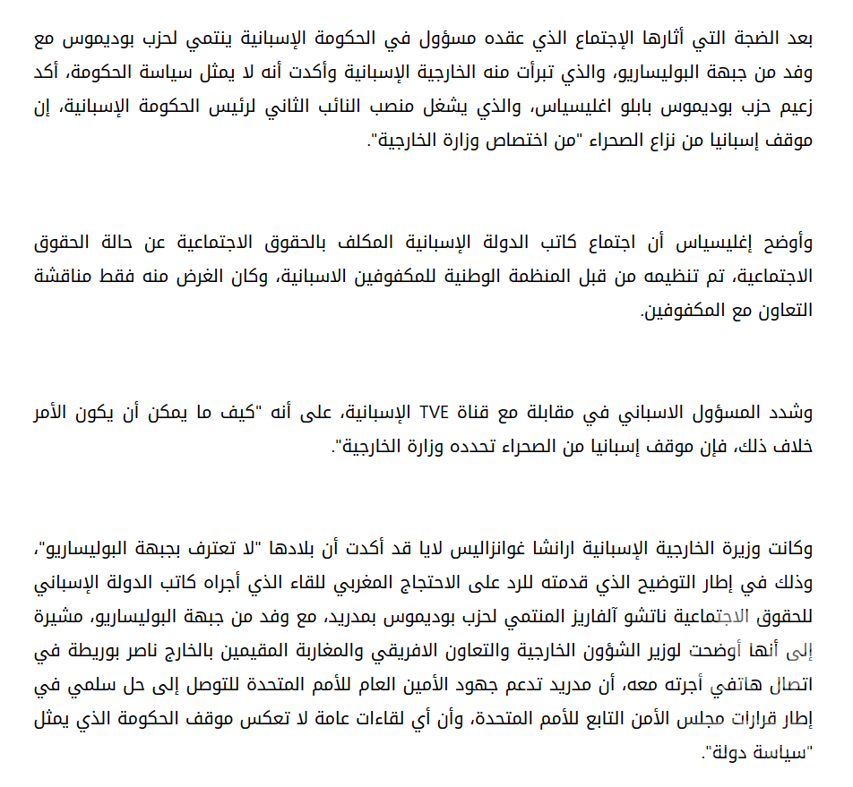 www.le360.ma - استقبل وزير ينتمي لحزب بوديموس في الحكومة الحالية برئاسة الاشتراكي بيدرو سانشيز، يوم الجمعة 21 فبراير في مكتبه في مدريد، وفدا لما يسمى بـ "الجمهورية الصحراوية"، برئاسة ما يسمى بـ "وزير الشؤون الاجتماعية الصحراوية".ar.le360.ma