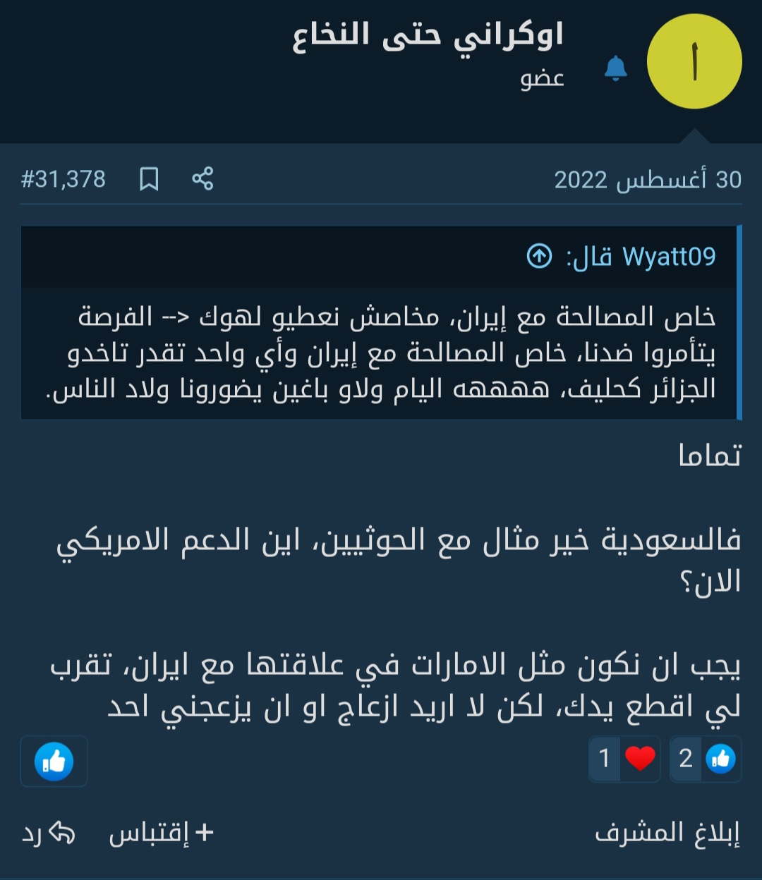 ها أنا، ههههههه باقي على الموقف ديالي، أي واحد لي تقدر تاخدو الجزائر كحليف خاصنا نوضحوا معاه الضواسا، و نخليوه يشد معانا Neutre، مخاصش تكون عندنا فكرة العداء ضد أي واحد متقرب من الجزائر، العداء للجزائر مخاصوش يكون محدد للسياسة الخارجية المغربية، وأصلا هاذشي لي كاين وغادا فيه الدولة ووزارة الخارجية، الدولة الوحيدة لي كنحمروا معاها العين، ماشي بالأساس الدعم ديالها للجزائر ولكن لأسباب عقائدية هي إيران، خاصنا توضيح وجهات النظر مع إيران، ولكن فنفس الوقت متخليش ليهم الفرصة و لا تخوي ليهم الساحة في غرب إفريقيا باش ينشروا المعتقد الشيعي، الإشعاع العقائدي للمغرب و لإمارة المؤمنين في غرب إفريقيا و العالم ككل خاصو يكون ويزيد يكبر، بعيدا على الحرب العقائدية بحكم أننا حنا وياهم عندنا فهم مختالف كليا للدين وكيفية الممارسة ديالو فمنظنش أن التقارب غادي يطرا ولا الجلوس على الطاولة و الموقف ديالنا واضح تمام الوضوح، هما باغين ينشروا العقيدة ديالهم و الولاء للإمام وحنا ماعاجبناش داكشي ما كتعتابر تهديد مباشر لإمارة المؤمنين و التماسك المجتمعي لا فالبلاد و لا فالقارة، ولقيناها من الخير و الإحسان أن التقارب بينهم و بين الجزائر يقدر يخلينا نسوقوا لعداء إيران ضد المغرب فواشنطن، داكشي لي غادي يخلي واشنطن تقدر تشوف فينا مستفيد محتمل لبعض المساعدات. المهم المغرب غادي يدير شنو فمصلاحتوا.