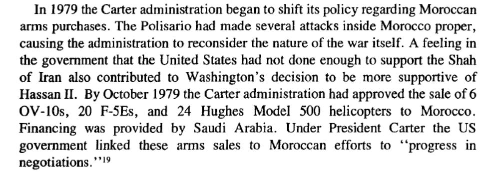 by october 1979 the carter administration had approved the sale of 6 OV-10s, 20 F-5Es, and 24 hughes model 500 helicopters to morocco. Financing was provided by saudi arabia