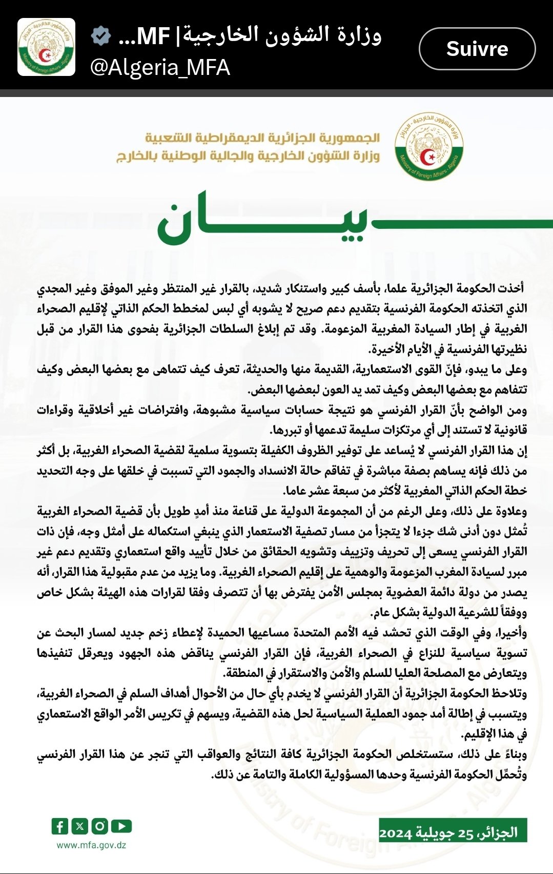البيان الرسمي لوزارة الخارجية الجزائرية من اجل ان يطلع عليه الاعضاء الذين يصدعون رؤوسنا عن الاخوة والمحبة بين الاشقاء ووو..
