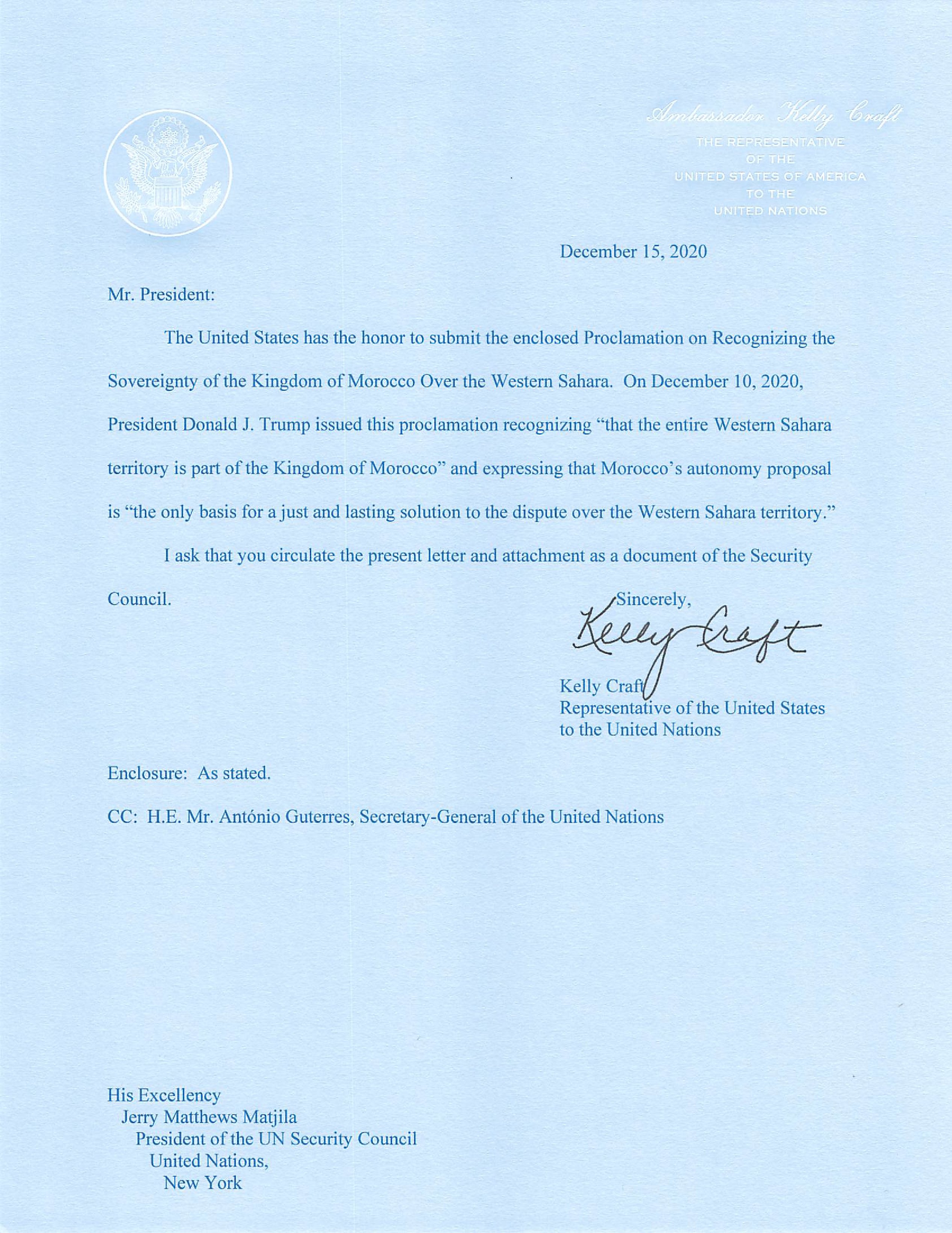 الولايات المتحدة تخبر الأمم المتحدة رسميا اعترافها بسيادة المغرب على الصحراء و تخبرها أن الحل الوحيد و الواقعي للصحراء هو حكم ذاتي تحت سيادة المغرب 😉
