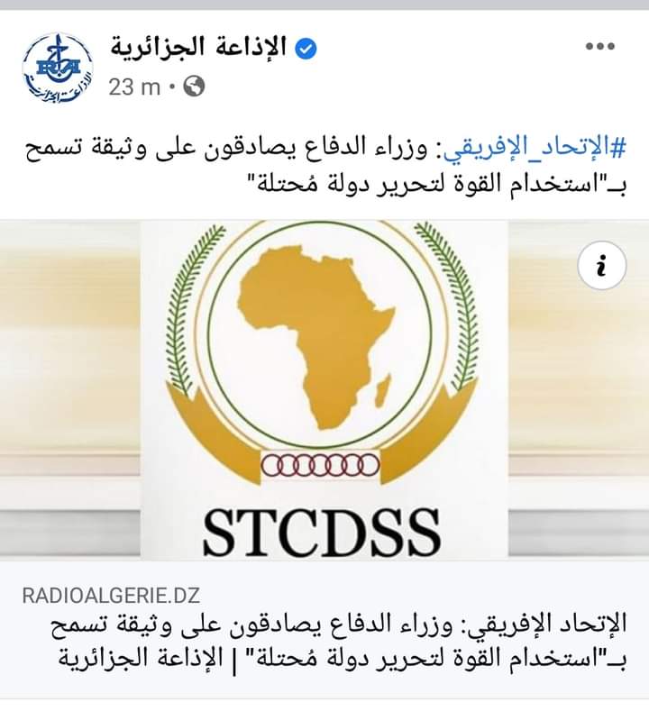 بعد فشل الحرب الوهمية للبوليساريو التي وصلت 80 بيان بدون نتيجة ، و بعد فشل التهديدات الصبيانية بصاروخ اسقنضر و السوخوي و الميغ الجزائر تستلم و تعترف بضعفها أمام المغرب و تستنجد بالافارقة الحفاة العراة ليحاربوا المغرب بدلا عنها ، رغم أن الخبر مفبرك اصلا و لا صحة له لكنه يعطيك فكرة عن الفشل و الحصلة الجزائرية![]()