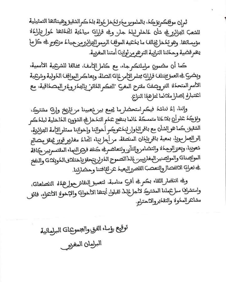 بينما الدولة الجزائرية مجندة من صغيرها إلى كبيرها ضد المغرب و يصفون المغرب بالصهاينة و المحتلين و الأعداء ، برلمان الفشل المغربي يرسل رسالة أخوة و صداقة لبرلمان الجزائر ، صراحة استغرب كيف يفكر البرلمانيون المغاربة و كيف يسمحون بإرسال مثل هذه التفاهات ، كنت شخصيا انتظر رد ناري من البرلمان و ليس رسائل الاخوة ، للأسف