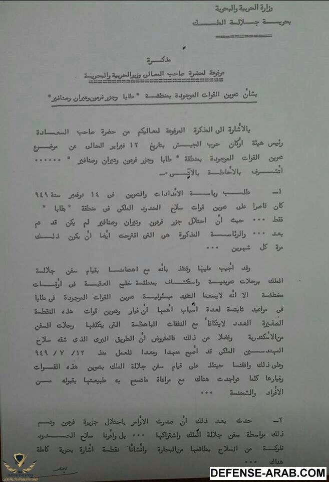 الأن أستفساري اخي الكريم الرسالة التي وضعتها للملك فاروق رحمه الله ألم تكن بعد أحتلال إسرائيل لفلسطين. طيب اذا كان كذلك أليس هذا ما يقوله الأخوة السعوديين بأنهم أسندوا الدفاع عن هذه الجزر بعد الأحتلال الأسرائيلي لمصر. سواء طلبها الملك فاروق أو بطلب من الملك عبدالعزيز المهم الجزر تحت الحماية المصرية منذ ذلك التاريخ. فهل وجود مراسلات تذكر هذه الجزر بعد ذلك التاريخ تثبت أن الجزر مصرية ؟