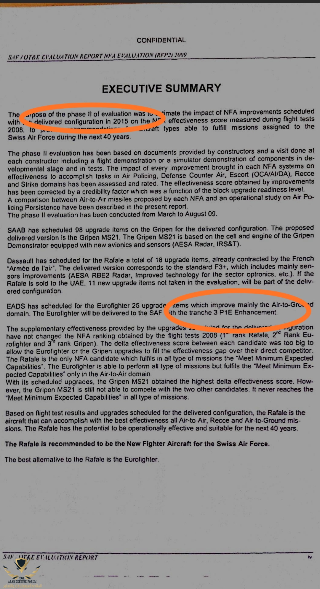 لكن لو جئنا لسلاح جوي محايد مثل القوات الجوية السويسرية والتي قامت باختبارات محايدة للرافال والتايفون والجريبين ومن بينها قدرات الهجوم الارضي .. ولم تكتفي باختبارات الطائرات وقتها لكن اخذت ايضا في الحسبان التطويرات المستقبلية للطائرات حتى عام 2015 .. وعند الكلام عن التايفون كان المعيار المقترح على السويسريين هو الترانش 3 p1e والتي كان اغلبها مخصص لتحسين قدرات الاستهداف الارضي .. ورغم ذلك حققت التايفون تقدير low to good