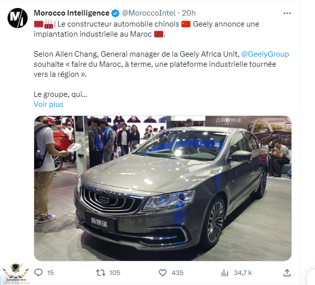 مصدر الخبر؟أعلنت شركة Geely الصينية و هي شركة مساهمة فيشركة volvo انها ستحدت مصنعا لصناعة السيارات( بنوعيها الوقود و الكهرباء ) في المغرب في مدينة الدارالبيضاء و سيبدء الإنتاج سنة 2026 و تهدف للسيطرة على %1 من السوق الداخلي سنة 2026 و تحويل المغرب إلى قاعدة للتصدير نحو أوروبا و أفريقيا و بالتالي يصبح هدا 3 مصنع للسيارات في المغرب بعد مصنعي رينو في مدينتي (طنجة و الدار البيضاء ) و مصنع ستيلانتيس (فيات) في مدينة القنيطرة