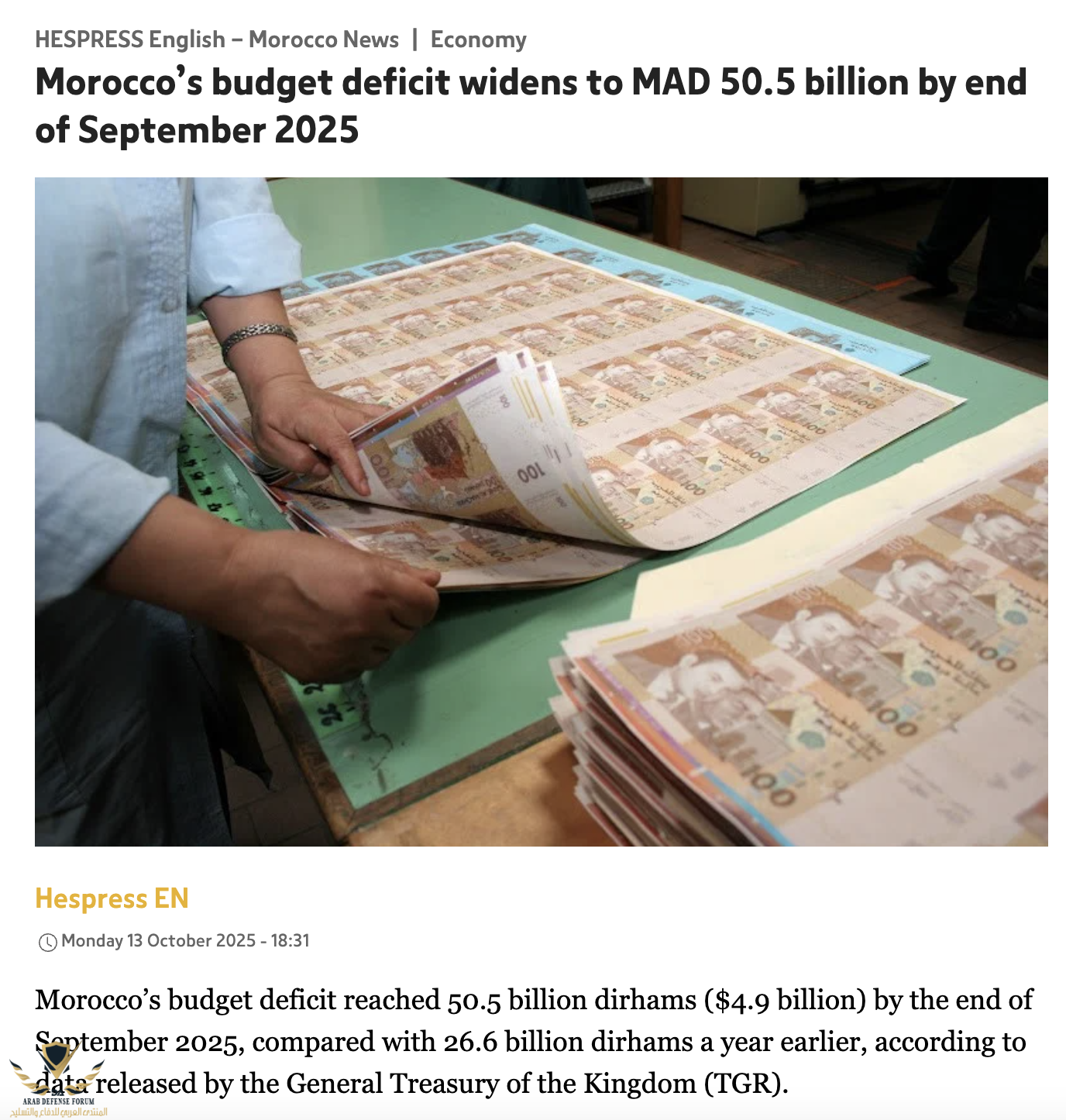 Morocco’s budget deficit reached 50.5 billion dirhams ($4.9 billion) by the end of September 2025, compared with 26.6 billion dirhams a year earlier,en.hespress.com