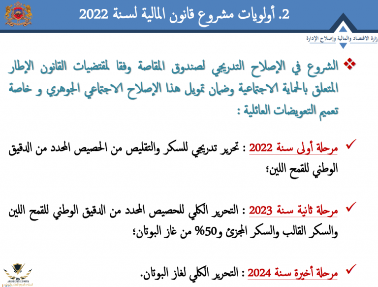 من ضمن أولويات مشروع قانون المالية حسب عرض وزير الإقتصاد و المالية ، نجد الشروع في الإصلاح التدريجي لصندوق المقاصة وفقا لمقتضيات القانون الإطار المتعلق بالحماية الإجتماعية و ضمان تمويل هذا الإصلاح الإجتماعي الجوهري وخاصة تعميم التعويضات العائلية