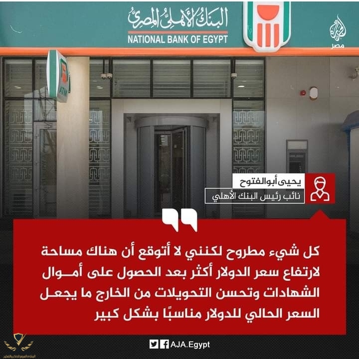 نائب رئيس البنك الأهلي يحيى أبوالفتوح يقول بمداخلة متلفزة إنه لا يتوقع مزيدًا من الارتفاع بسعر الدولار بعد تحصيل أموال الشهادات التي طرحها البنك قبل أيام