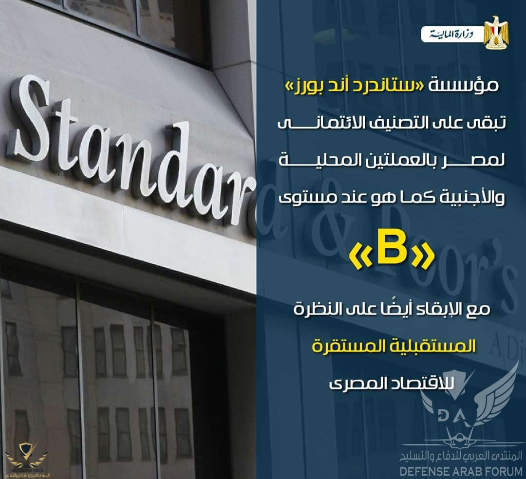 الحمد لله الواضح فعلا اننا ماشيين على الطريق الصح في الاصلاح الاقتصاديالاخبار الايجابية وقت الازمات هى اللى بتطمنا وتأكد ثقتنا فى قوة اقتصادنا ... أعلنت مؤسسة «ستاندرد أند بورز» عن الإبقاء على التصنيف الائتمانى لمصر بالعملتين المحلية والأجنبية كما هو عند مستوى «B» مع الإبقاء أيضًا على النظرة المستقبلية المستقرة للاقتصاد المصرى «Stable Outlook»، وده بيعكس ثقة المؤسسات الدولية، ومؤسسات التصنيف الائتمانى فى قدرة الاقتصاد المصرى على التعامل الإيجابى مع أزمة «كورونا» ....استمرار اشادة المؤسسات الدولية بالاقتصاد المصرى في وقت تأثرت فيه اقتصاديات دول كتير بيأكد نجاح برنامج الإصلاح الاقتصادي اللى تم بمساندة الشعب المصري خلال السنوات الماضية.