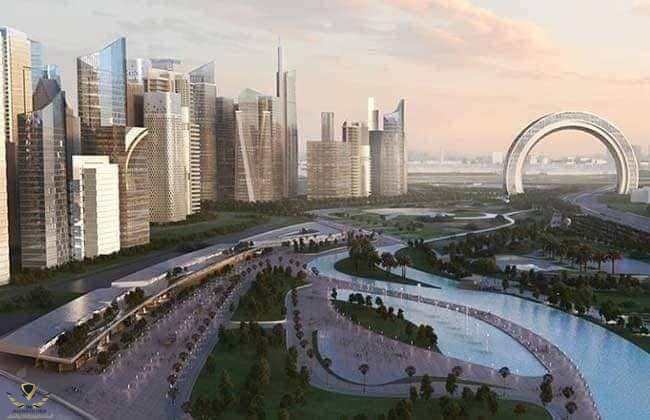 ويبلغ ارتفاعه حوالى 600 م، وطوله 1600 م، وسيكون ثالث اعلى برج ويقع على الحديقة المركزية عند مدخل المدينة حيث يتواجه نحو الشرق والغرب تعبر الشمس من داخل الحلقة الى المدينة من خلال الطريق الرئيسى ( محمد بن زايد ).