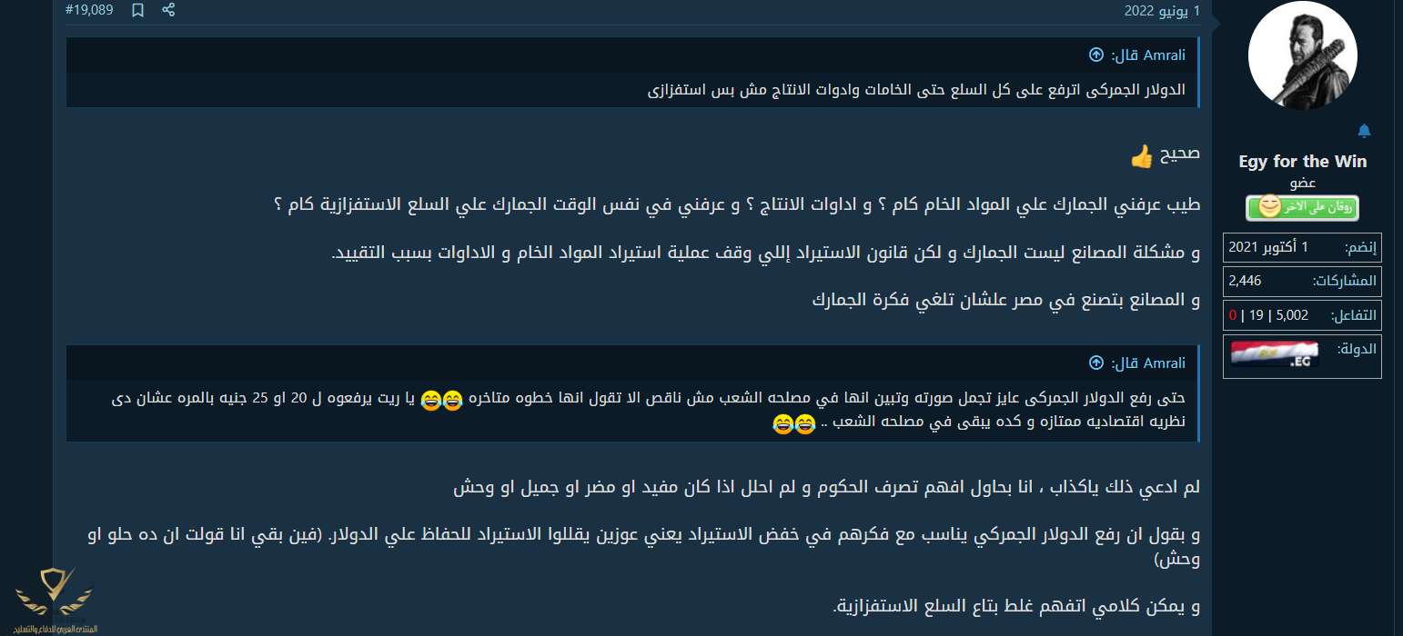 وبعدها فجاه باسبوع بعت لى لينك قرار جديد اعفاء لسلع وخامات.. فرحان اهى اي حاجه تسند معاك 😂 ( طبعا كل ده راي تحليلى واخد بالك .. اصلك زعلان ازى لما قلت لك انك بتجمل الصوره وانت تقولى يا كذاب لا انا بحلل فقط 😂😂😂 ) .. بس للاسف انت كنت فاكره في صالحك وهو مش في صالحك ..وانا شرحت لك ليه في المساركه الى فاتت في نقطتين مش هعيدها .. وضربت لك مثال بسلعه استراتيجية كالدواء .. وكعادتك بتحب الجدال للجدال مش عايز تتعلم والله .. انت عايز تنتصر لذاتك ولو باى طريقه