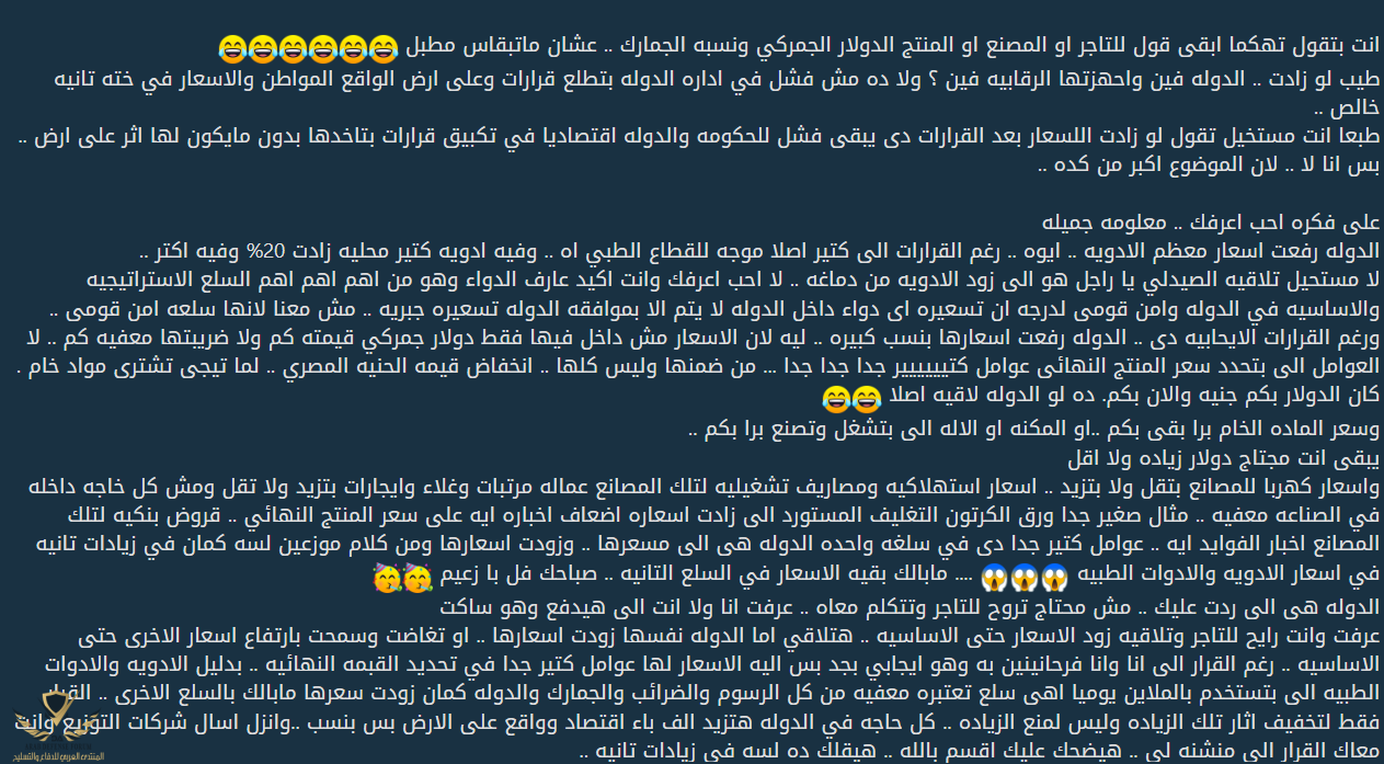 واخد بالك .. ورد عليك اخ هنا قبلى الرفع على كله سلع اساسيه استرتيجيه وغير استراتيجية.. وانا بعده كملت معاك .. فقلت لى انا فقط بحلل الحكومه عملت ليه كده .. 😂😂😂😂😂😂😂😂😂😂