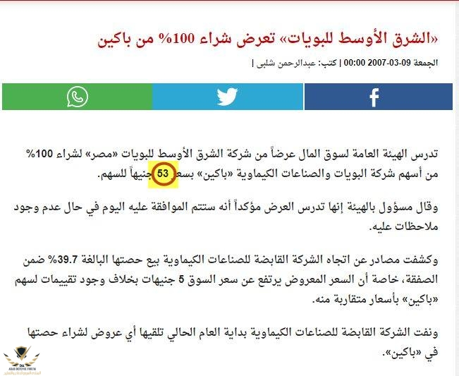 العرض كان عام 2007 مش 2018 انا اخطأت فى التاريخ وكان بقيمة 53 جنية اى مايعادل 9 دولار وقتها حاليا العرض بعد التعويم يعادل 90 سنت تقريبا ده شىء لايستوعبه عقل احنا فشخنا المنطق ,, بالرغم من وجود عدة شركات منافسة تبقى باكين بمخزون اراضيها وحجم استثماراتها فى مصر وليبيا شركة كبيرة وسعرها العادل يتجاوز هذا العرض بنسبة 200 %