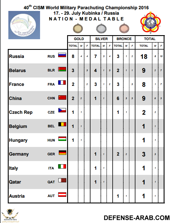 شارك منتخب الإمارات العسكري للمظلات في بطولة العالم العسكرية والتي إقيمت في جمهورية روسيا الإتحادية خلال الفترة من 17 / 7 الى 29 / 7 / 2016 محققا انجازا جديدا يضاف لإنجازاته السابقة وذلك بتحقيقة المركز السادس متقدما على المنتخب الفرنسي والإيطالي في مسابقة دقة الهدف على مستوى العالم، ومحققا المركز الاول عربيا متقدما على الجزائر وسلطنة عمان والبحرين والمملكة المغربية والعديد من الدول العربية المشاركة، والاول اسيويا متقدما على كوريا الجنوبية وماليزيا وإندونيسيا والصين وايضاً العديد من الدول الآسيوية وذلك خلال مشاركته في بطولة العالم العسكرية للمظلات 40 والتي انتهت مؤخرا.