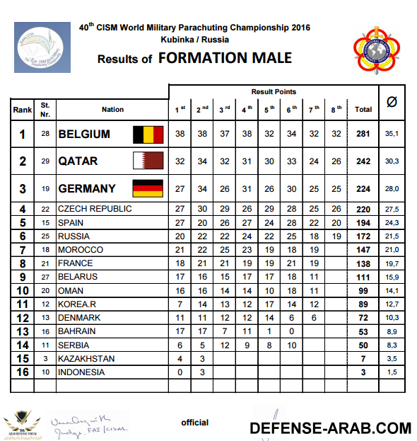 والجدير بالذكر بان منتخبنا العسكري للمظلات كان قد شارك في بطولة سويسرا العالمية وبمشاركة أفضل عشرة منتخبات في العالم بمسابقة دقة الهدف والتي أقيمت قبل بطولة العالم محققا الميدالية البرونزية والمركز الثالث في تلك البطولة ،وبالعودة الى تفاصيل بطولة العالم العسكرية للمظلات 40 فقد كانت من أقوى البطولات التي أقيمت في السنوات الاخيرة حيث لم تحدد المراكز الستة الاولى الا في الجولة العاشرة والتي تسمى بالجولة الذهبية حيث انتزع المنتخب المجري المركز الاول والذهبية من صاحب الارض المنتخب الروسي بفارق سم واحد فقط ويتكون وفدنا المشارك من : المقدم خالد الزعابي رئيسا للبعثة والجهاز الاداري الرائد مسلم احمد البلوشي والنقيب محمد الشامسي واحمد الرئيسي وعضو اللجنة الدائمة للمظلات في السيزم المقدم /م محمد يوسف والمدرب الفرنسي فرانس واللاعبون يوسف البلوشي وعيسى ابراهيم البلوشي وعيسى الدرمكي ومحمد عبيد السويدي ومطر السويدي واحمد غيث وعلي حسين وعبدالرحمن البلوشي وأسد البلوشي.