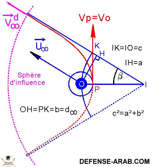 كما أن اتجاهها هو اتجاه المقارب الهذلولي و الذي تحدده الزاوية β كما هو مبين في الشكل حيث cos β = 1/e حيث e =excentricity الانزياح المداري للهذلـول و الذي يمكن اعتباره اهليلجا لانهائيا عندما تكون قيمة e > 1 .. كما راينا فوق في الحديث حول الأقمار فقيمة e تحددها السرعة المكتسبة على المدار عند بداية المناورة و بالتالي فان قيمة و اتجاه V ∞ يتعلق بشكل اساسي بالسرعة V0 في اول مناورة الافلات ..