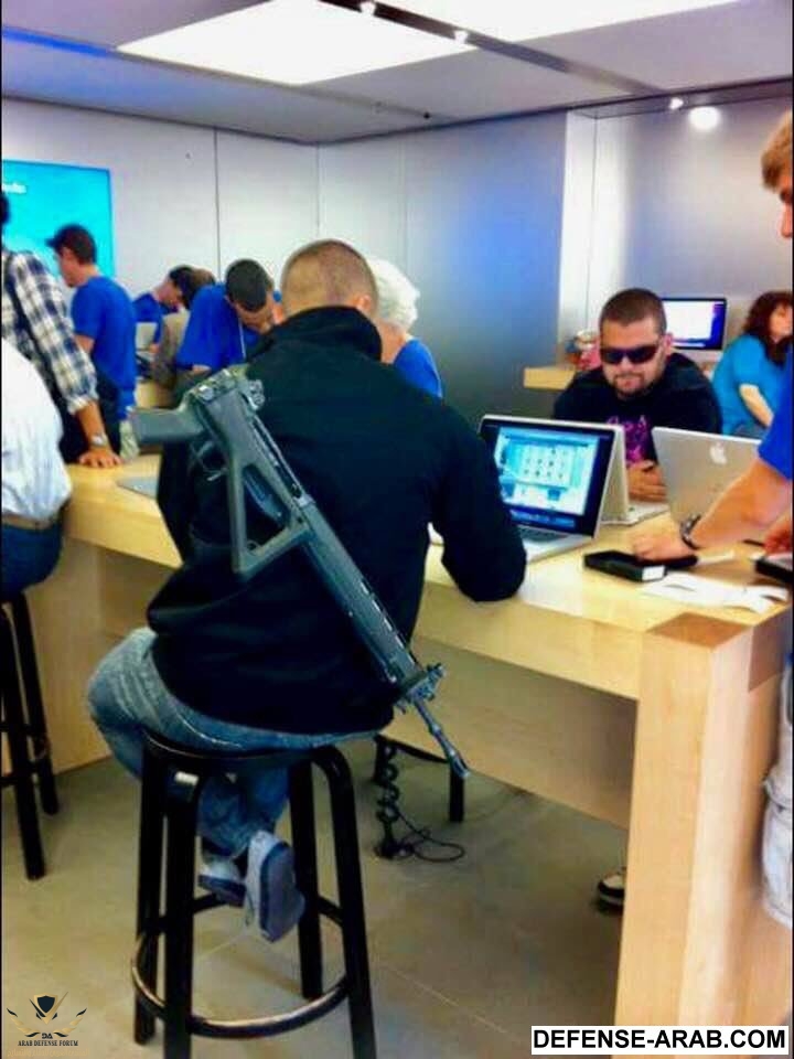 عندما تكون جالس مسترخي في ملابسك المدنية مع بندقيتك الهجومية في متجر أبل_ جنيف سويسرا... ولا أحد يهلع... لأنك مجرد رجل مع بندقية وثقافة البندقية والقوانين في بلدك آمنة