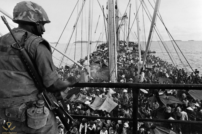 صورتان تختصران مشهدي كابل وسايغون شخن متعاونين فيتناميين على متن سفينة، وشحن متعاونين أفغان بطائرة شحن.