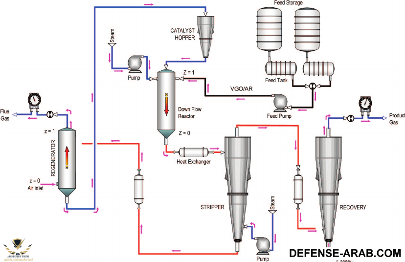 The main features of the HS-FCC process are: a down-flow reactor, high reaction temperature, short contact time and high catalyst to oil ratio (C/O). The HS-FCC process operates at high temperature and high C/O ratio resulting in two competing cracking reactions, thermal cracking and catalytic cracking . Thermal cracking contributes to the production of dryc gas while catalytic cracking enhances the yield of propylene.