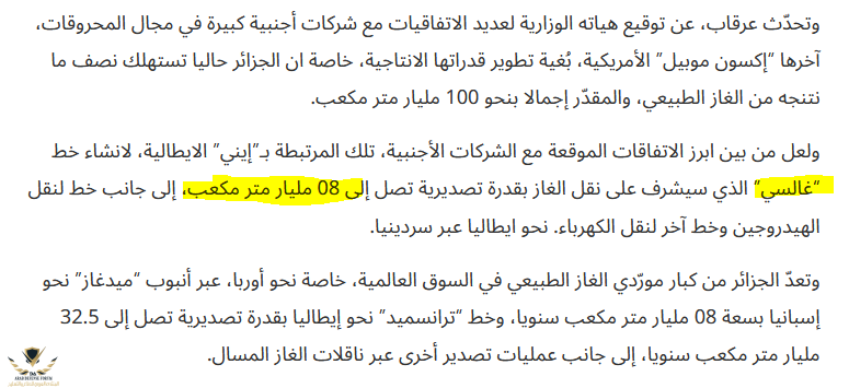 إنشاء أنبوب غالسي و ربط كهربائي مباشر مع إيطاليا أكثر من استراتيجي، يجب التركيز عليهما في المفاوضات مع إيطاليا و أوروبا، اليوم الوزير الأول السلوفيني في الجزائر و أتوقع إتفاقيات لربط أوروبا الشرقية بالغاز الجزائري عبر سلوفينيامشاهدة المرفق 689133مشاهدة المرفق 689134