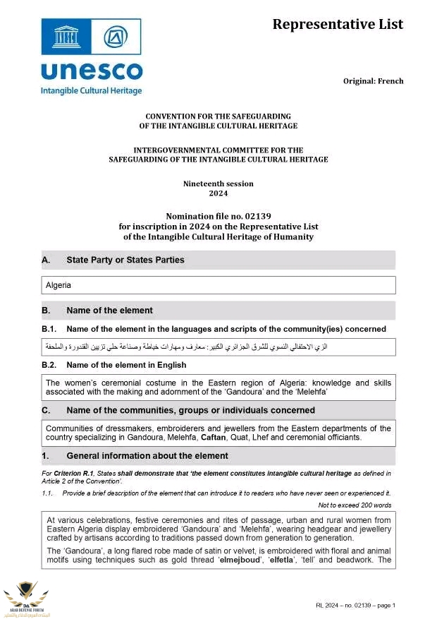 الجزائر تسجل في اليونيسكو اليوم "القندورة، الملحفة ، القفطان، القاط، القويط، اللحاف، الشاشية، السروال، الدخيلة، اللوقاع، المنديل، القنور، الحزام" المطرزة عن طريق المجبود، الفتلة، الكنتيل، التل، الترصيع والتعمار، أما فيما يخص الحلي الفضي والذهبي نذكر: الشاشية بالسلطاني، الجبين، خيط الروح، المناقش، المشرف، المخبل، السخاب، المحزمة، الحزام، الحرز، ابزيم، المسايس، المقايس .الخلخال والرديف