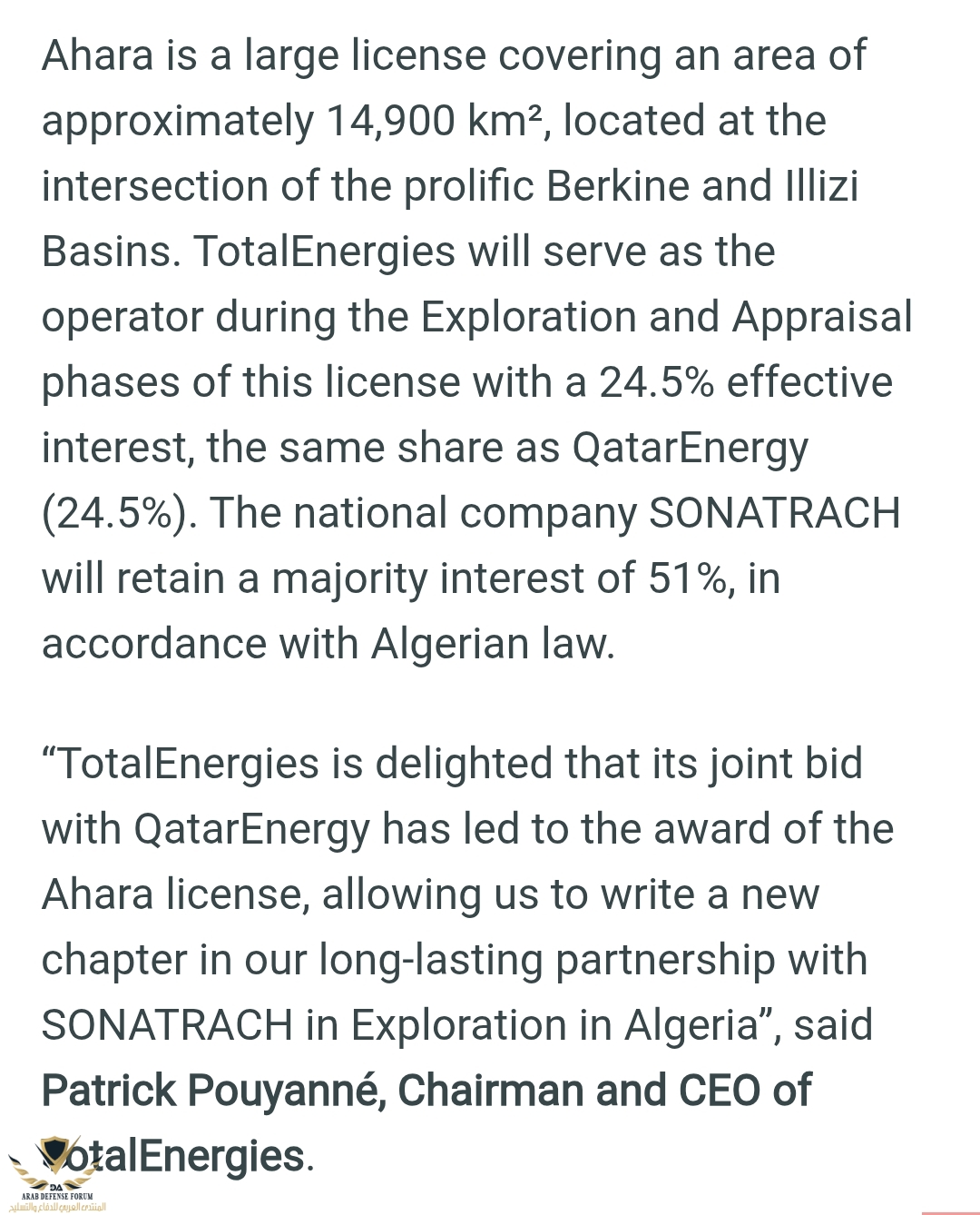 Paris, June 17, 2025 – TotalEnergies, jointly with QatarEnergy, has been awarded the Ahara license following the “Algeria Bid Round 2024”, launched by The National Agency for the Valorization of Hydrocarbon Resources (ALNAFT), the first call for tender conducted under the hydrocarbon law No.19-13.totalenergies.com