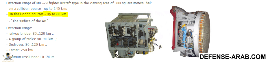 yf22 قال: يعنى المدى فى حالة المسار المتعرج او الغير منتظم لاشعة الرادار و هو 60 كلم و اليك هذه النسخة الانجليزية الصحيحة من نفس الصفحة التى اوردتها http://www.niip.ru/eng/index.php?op...12-25-58&catid=8:2011-07-06-06-33-26&Itemid=8 أنقر للتوسيع... مشكور ّتحّ رادار متخلف تحمله سو-30 علما ان الميغ-29 مقطعها الراداري ضخم