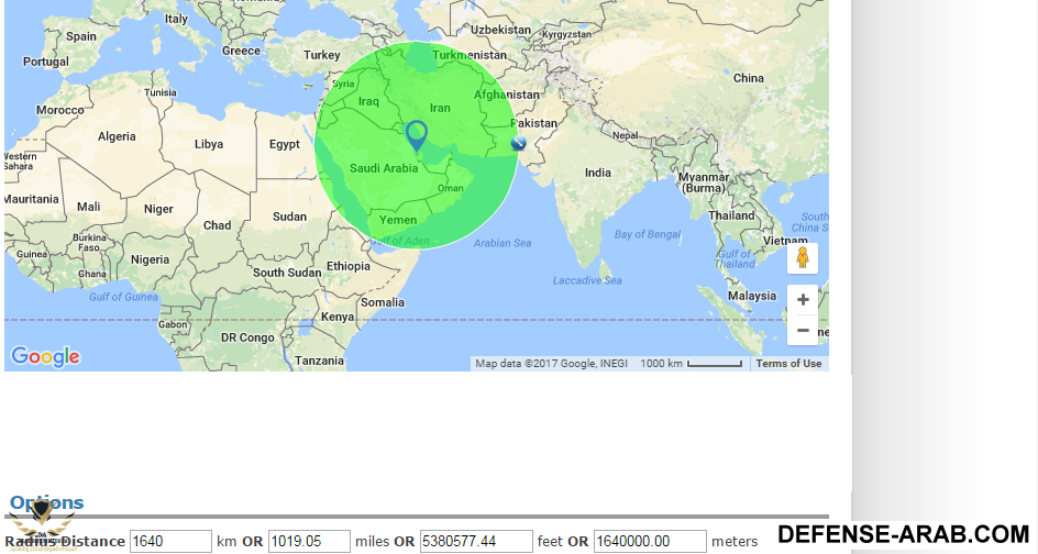 لو اخذنا بـ 1,640 كم بحسب ماورد اعلاه ,, هكذا سيكون المدى القتالي بالانطلاق من البحرين ..