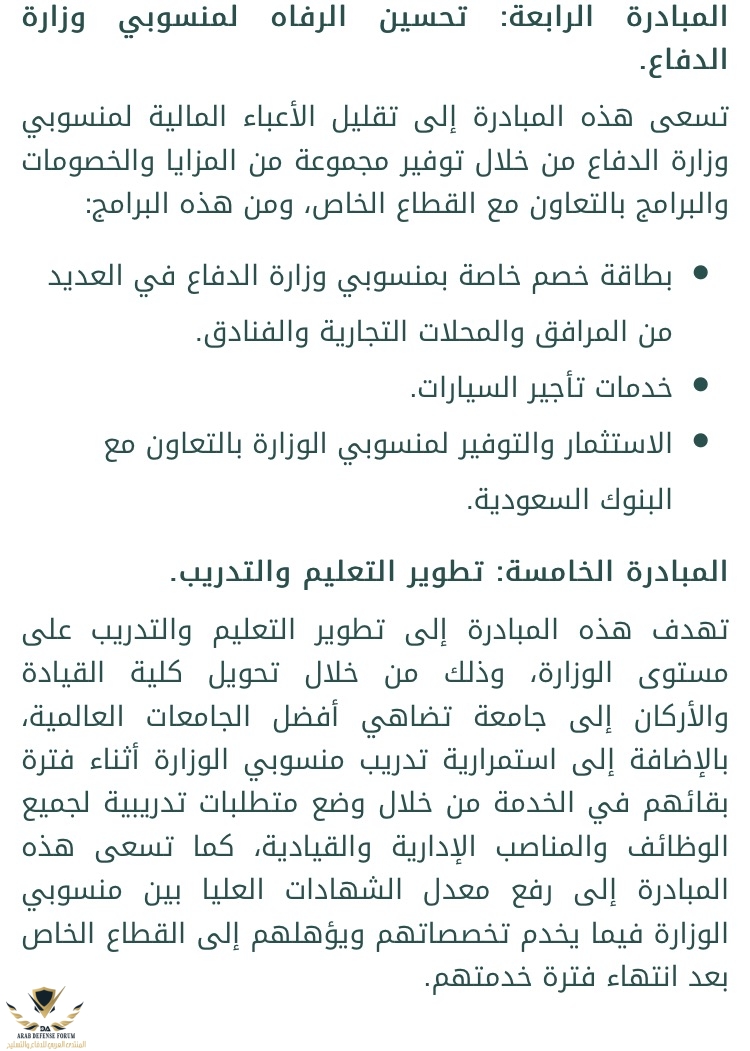 موقع وزارة الدفاع شالوا المبادرات الى منها بطاقة خصومات و استثمار لمنسوبيين مع البنوك و التدريب استفادة اثناء و بعد العمل و التقاعد و غيروها انهم يعملوا على 308 مبادرة بدون التفاصيل السابقة اخاف انهم تراجعوا او غيروا التوجه