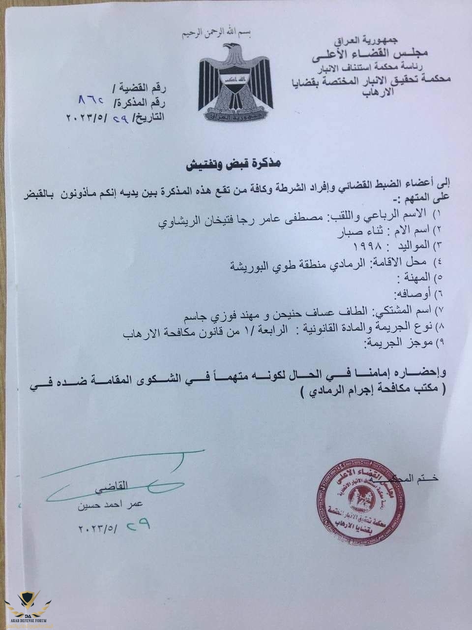 وشملت أوامر القبض الصادرة عن مكتب تحقيق الرمادي سطام أبو ريشة وخضر عامر رجا وعبد الله مؤيد عبيد، وخليل عامر رجا، وعبد الرزاق مشرف فتيخان ومصطفى عامر رجا، وضاري عبيد الريشاوي.