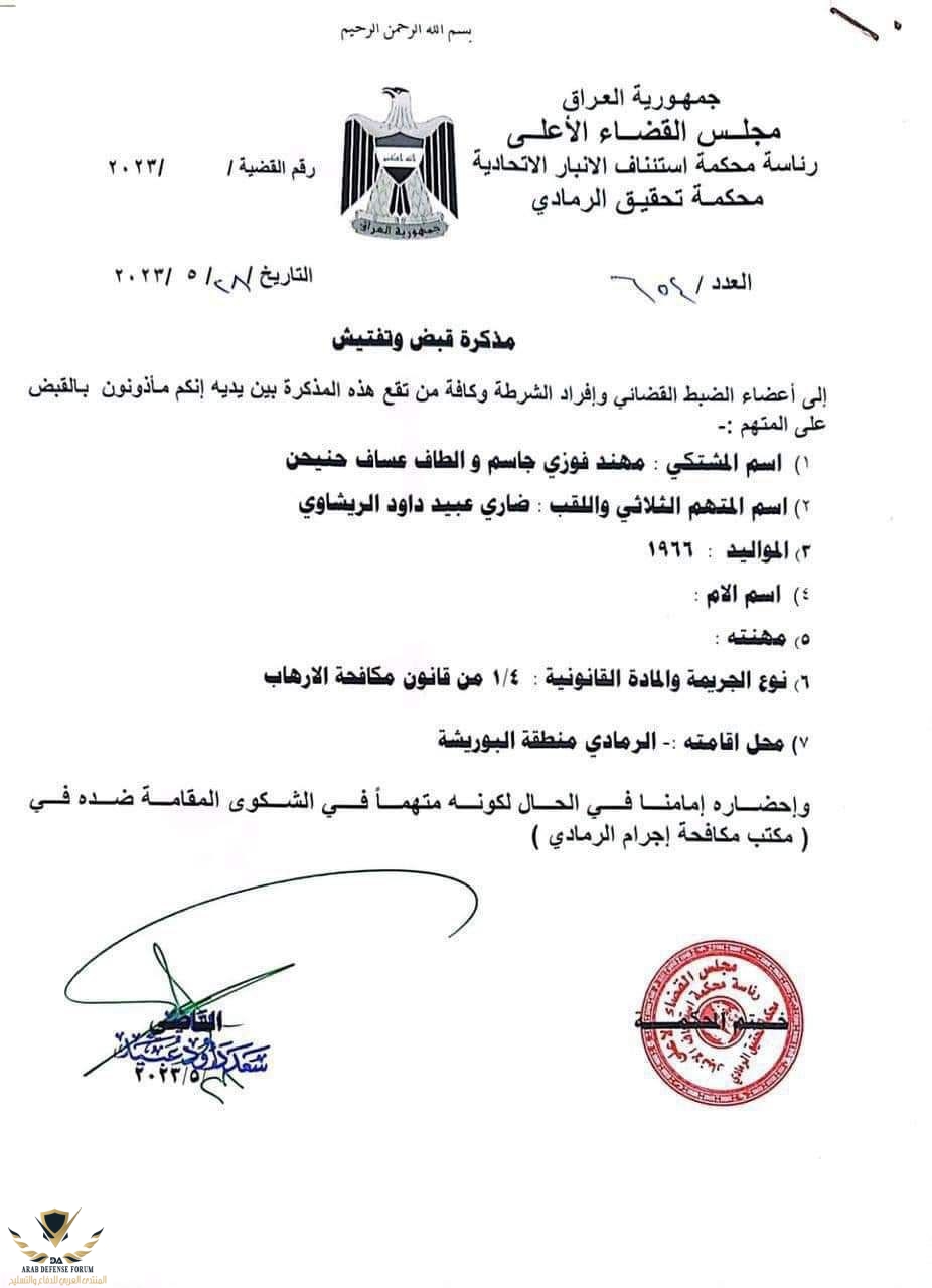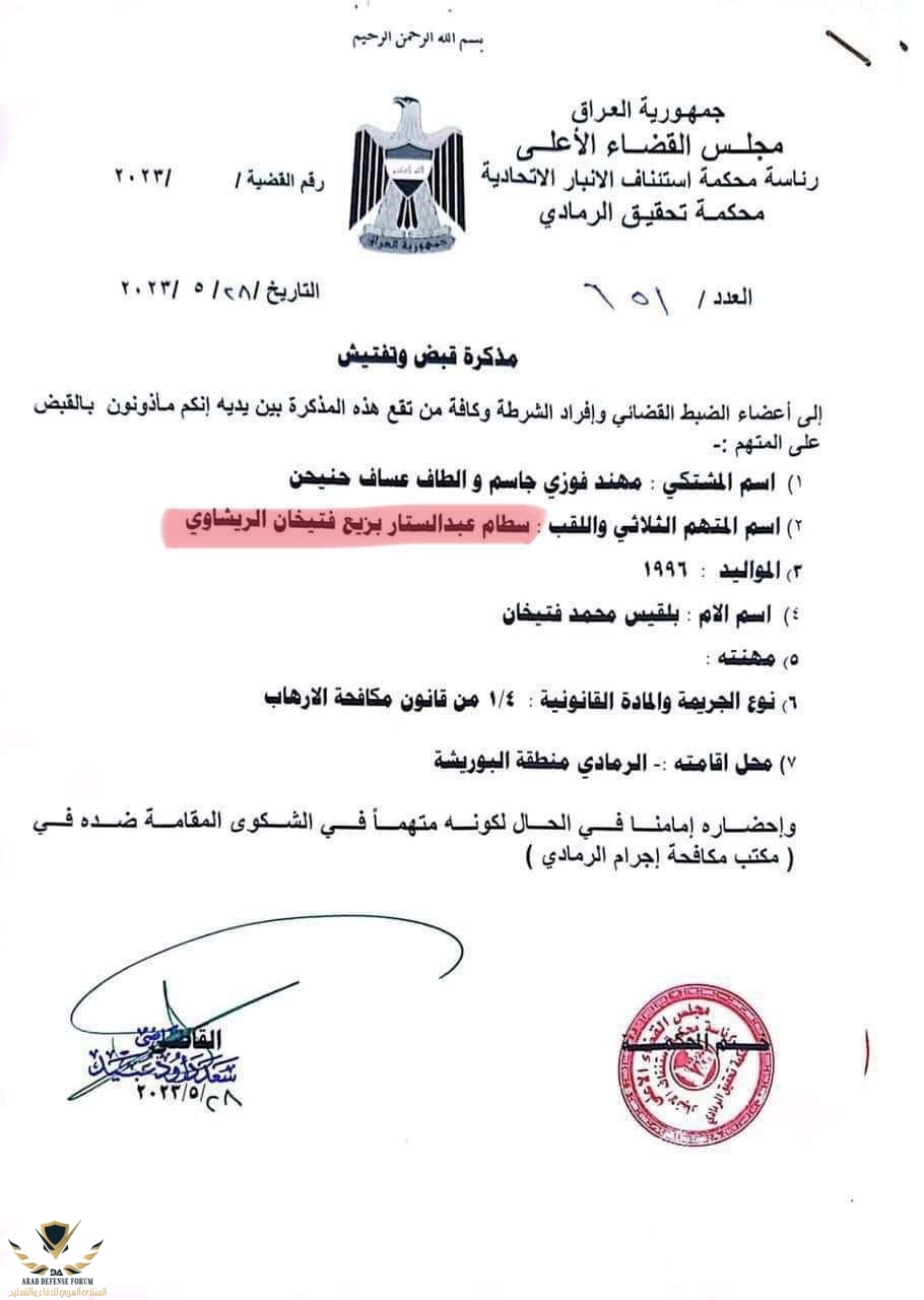 أصدرت محكمة عراقية، أوامر قبض بحق سطام أبو ريشة و6 أشخاص آخرين في محافظة الأنبار بتهمة الإرهاب، بناءً على شكاوى بحقهم قُدمت لمكتب مكافحة الإجرام.