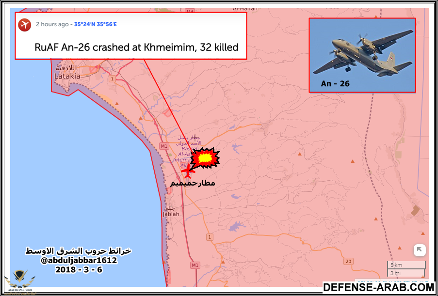 تطحم طائرة نقل روسية من نوع An - 26 في مطار حميميم باللاذقية ومقتل كل من على متنها 32 من ضمنهم ستة طاقم الطائرة والروس يقولون ان السبب خلل فني !