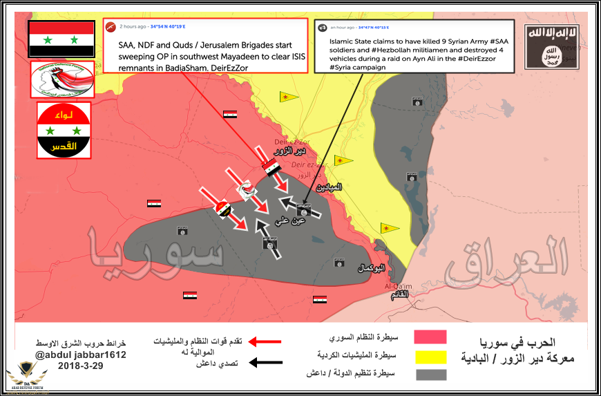 بعد الهجمات المتكررة التي قام بها تنظيم داعش على قوات النظام في الايام الماضية وسقوط العشرات من مقاتلي النظام واخرها صباح اليوم قوات النظام وبدعم المليشيات الموالية له لواء القدس ( مقاتلين فلسطنيين ) يشن حملة على البادية التي يسيطر عليها التنظيم جنوب دبر الزور وداعش يقول انه قتل 9 ودمر اربع سيارات .