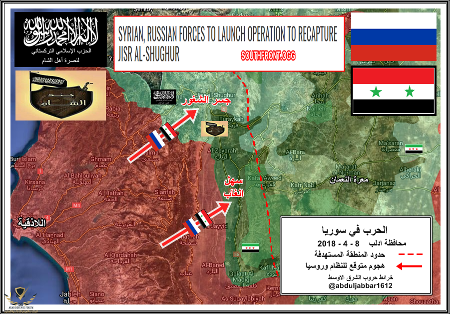 شمال غرب سوريا انباء عن تفاهمات تركية روسية من اجل شن هجوم تقوم به القوات السورية والروسية على منطقة جسر الشغور وسهل الغاب لطرد مقاتلي الحزب الاسلامي التركستاني وجند الشام الشيشانيين والمرتبطين بتنظيم القاعدة . نقلا عن موقع ( southfront.org )