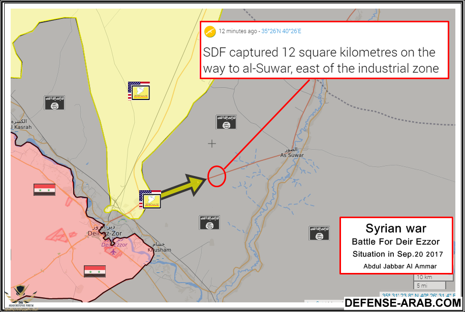 معركة دير الزور المليشيات الكردية ( قوات سوريا الديمقراطية ) وبامرتها بعض الاعراب المتجحفلين معهم تتقدم باتجاه منطقة الصور شمال شرق دير الزور تاركة حقل الغاز خلفلها وانباء غير مؤكدة عن انزال امريكي في حقول الغاز شمال دير الزور