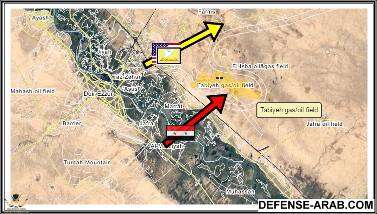 بعد التحية اخي العزيز ان ديرالزور هي الكعكة الكبيرة في سوريا لما تضمه من مكامن حقول النفط والغاز والفوسفات من خلال متابعتي للشان السوري اعتقد ستكون كما يلي النفط شمال الفرات وشرق الخابور والحسكة والقامشلي من حصة الامريكان النفط والغاز جنوب الفرات من حصة الروس وقد تكون هنالك حصة لتركيا شمال غرب سوريا اما الفوسفات في البادية الجنوبية الشرقية من حصة ايران وكل هذا تقدير شخصي مني وموضح في الخارطة الاولى على شكل اعلام الدول المستفيدة . اما ما يخص حقل ومجمع كونيكو للغاز فقد شهدت الايام الاخيرة سباق محموم بين النظام والمليشيات الكردية للوصول الى هذه المنطقة وخاصة بعد نجاح النظام في عبور الفرات والوصول الى خشام اصبح قريب جدا من هذا الحقل وهذا ما جعل المليشيات الكردي تغير اتجاه حركتها الى الشمال صوب الصور وهذا مبين في الخارطة الثانية