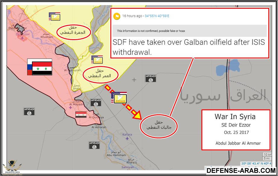 هزائم النظام في سباق الحقول النفطية امام المليشيات الكردية تتوالى واليوم اخبار عن سيطرة قسد على حقل كالبان النفطي اخر الحقول قرب الحدود العراقية ويبدو ان نظرية مناطق النفوذ الامريكي شرق الفرات قد اصبحت حقيقة ملموسة . ويبدو ان الشركات النفطية الروسية ستخرج من المولد السوري من غير حمص .