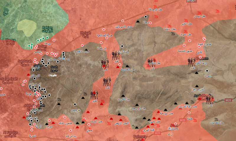 وتخوض قوات الأسد معارك منذ أشهر في المنطقة، ومنحتها السيطرة على السخنة حظوظًا أكبر في تمكين المحور الغربي عند عقدة (الشولا) نحو مفرق عقيربات وحصار البلدة.