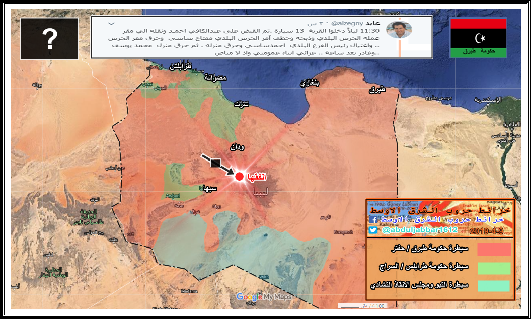 جماعة مسلحة تهاجم قرية الفقها في قلب الصحراء الليبية وتغتال عدد من اهالي القرية وتحرق البنايات الحكومية علما ان القرية تقع تحيت سيطرة حكومة طبرق / حفتر .